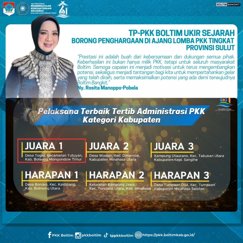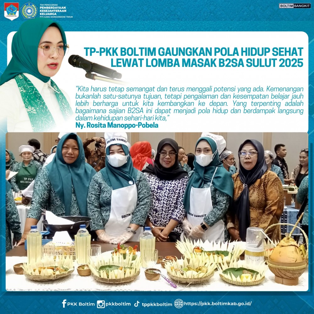 Dari Kabupaten Bolaang Mongondow Timur, kegiatan ini dihadiri oleh Ketua TP-PKK Boltim, Ny. Rosita Manoppo Pobela, didampingi Sekretaris TP-PKK, Ny. Lucia Kristina Sumaiku, serta jajaran pengurus lainnya. Kehadiran mereka merupakan bentuk nyata dari komitmen TP-PKK Boltim dalam mendukung program nasional, sekaligus memperkuat sinergi antarwilayah dalam pemberdayaan keluarga dan peningkatan kesejahteraan masyarakat.